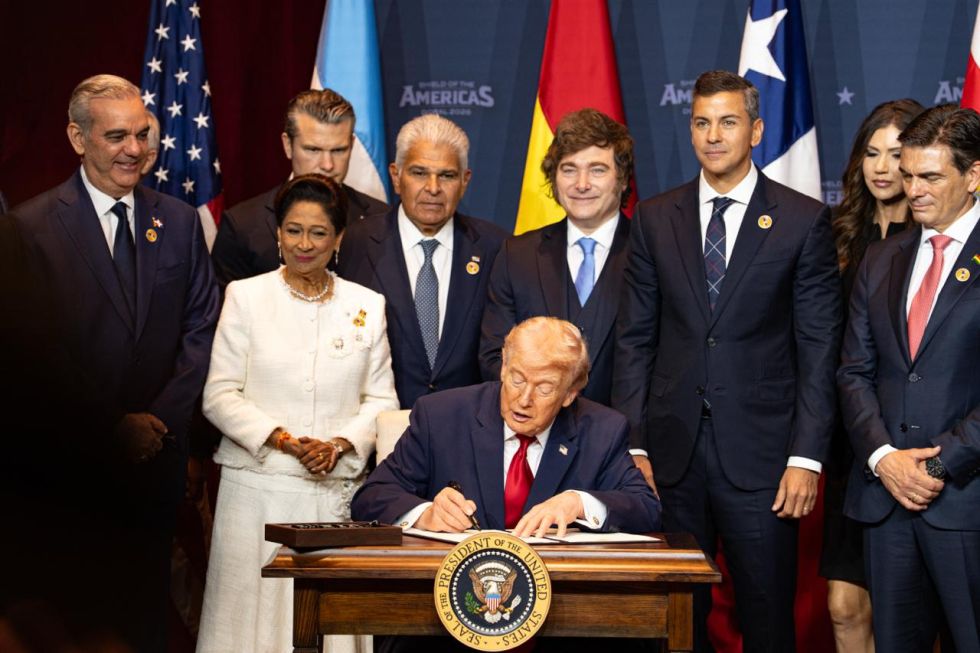 Los mandatarios que participan de la cumbre “Escudo de las Américas” son: Javier Milei (Argentina), José Antonio Kast (Chile), Rodrigo Chaves (Costa Rica), Luis Abinader (República Dominicana), Daniel Noboa (Ecuador), Nayib Bukele (El Salvador), Nasry Asfura (Honduras), José Raúl Mulino (Panamá), Santiago Peña (Paraguay) y Kamla Persad-Bissessar (Trinidad y Tobago), de acuerdo con información de la Casa Blanca.